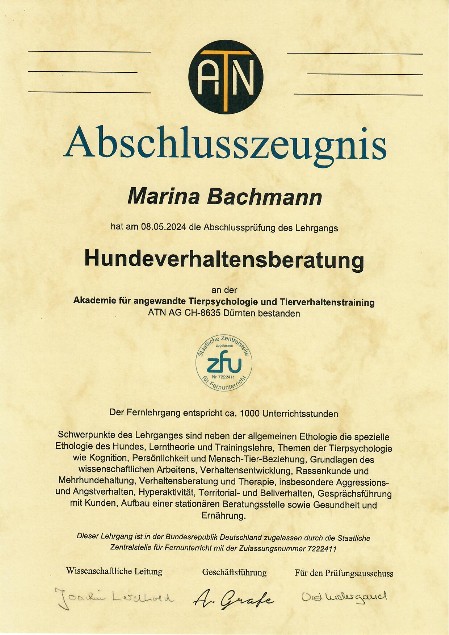 Hallo liebe Hundefreunde. Mein Name ist Marina Bachmann. Meine Familie und ich wohnen in Aarburg AG. Zu uns gehören auch die beiden Hunde Asuka und Baro. Seit ich denken kann, habe ich Tiere um mich. Die Ernährung von unseren Hunden liegt mir sehr am Herzen, deshalb entschloss ich mich im Jahr 2022, einen Lehrgang der ATN (Akademie für angewandte Tierpsychologie und Tierverhaltenstraining) als Hundeernährungsberaterin zu absolvieren. Im Mai 2024 konnte ich erfolgreich die Weiterbildung zur Verhaltensberaterin für Hunde abschliessen.