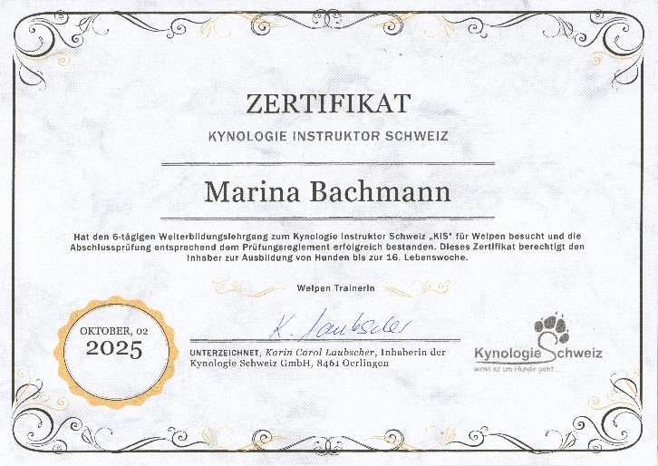 Am 2. Oktober 2025 durfte ich die Auszeichnung mit Zertifikat als Ausbildungsinstruktorin für Welpen bis zur 16. Lebenswoche entgegennehmen und freue mich nun, den wichtigsten Lebensabschnitt eines Hundes zu coachen und zu begleiten.